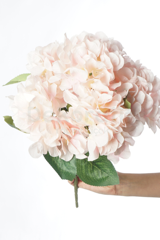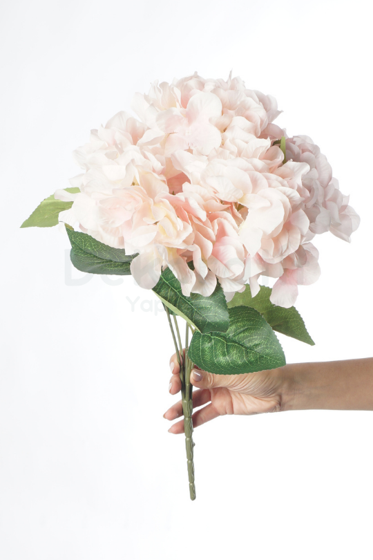 Yapay Uçuk Pembe Ortanca, yumuşak pastel tonları ve dolgun çiçek formuyla zarif bir atmosfer oluşturur. Açık pembe rengiyle romantik, sade ve doğal bir görünüm sunar.